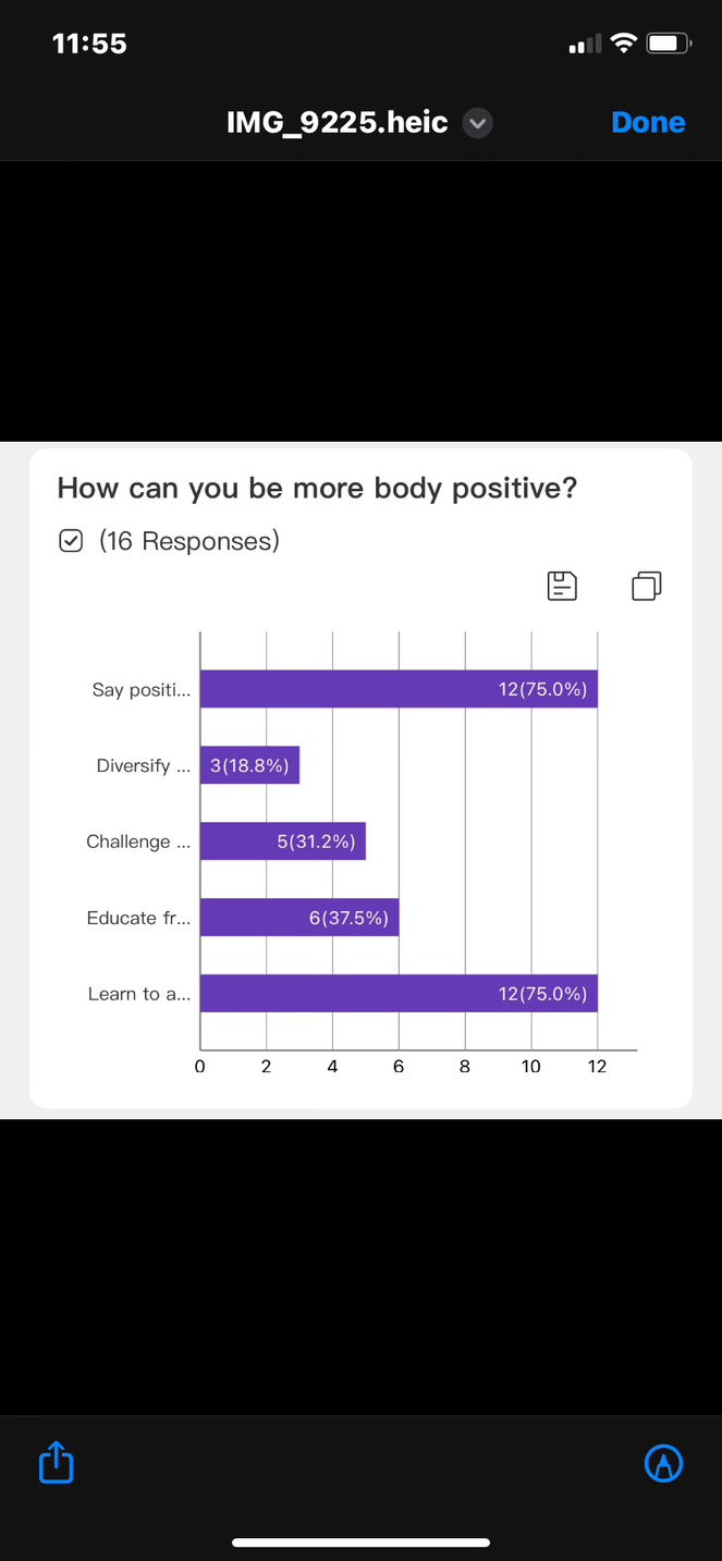 At the end of our presentation, we asked students how they, as an individual, can be more body positive. Learning to be more appreciative of their bodies and saying positive affirmations was most outstanding.